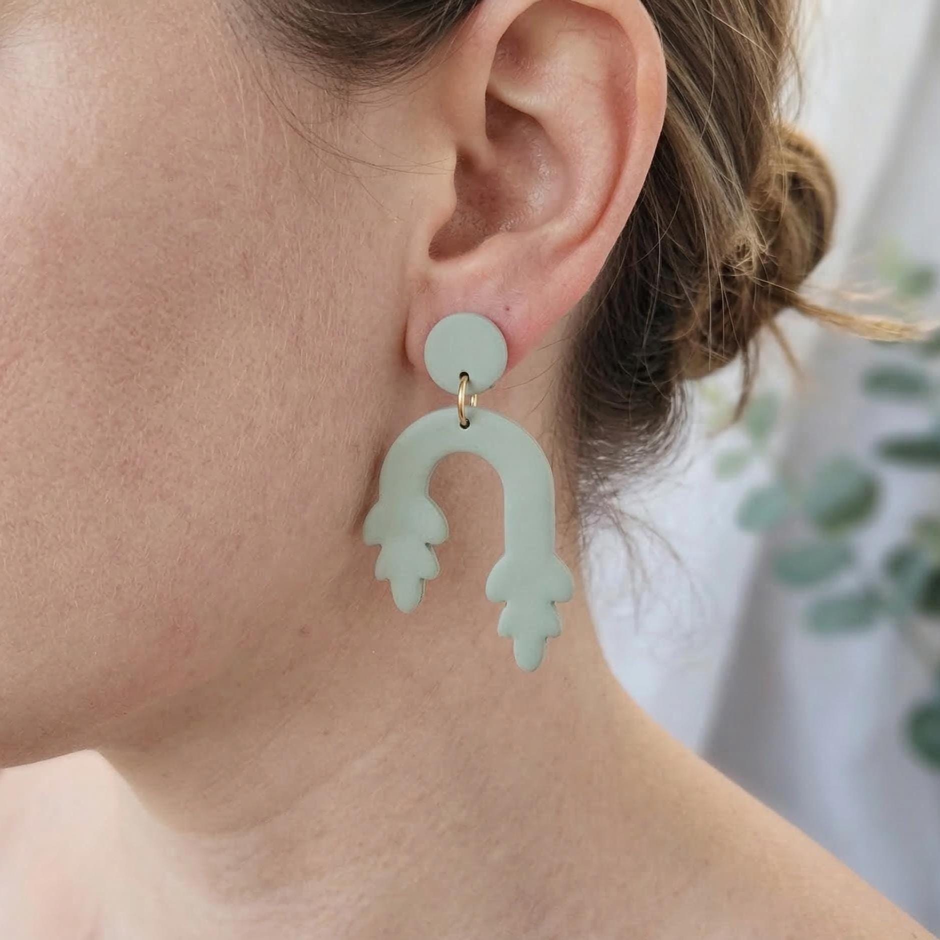 Make a sophisticated statement with these abstract polymer clay earrings. Featuring a unique U-shape or arch design finished with a delicate wavy, leaf-like edge, these pieces capture a unique blend of modern geometric and subtle botanical inspiration.